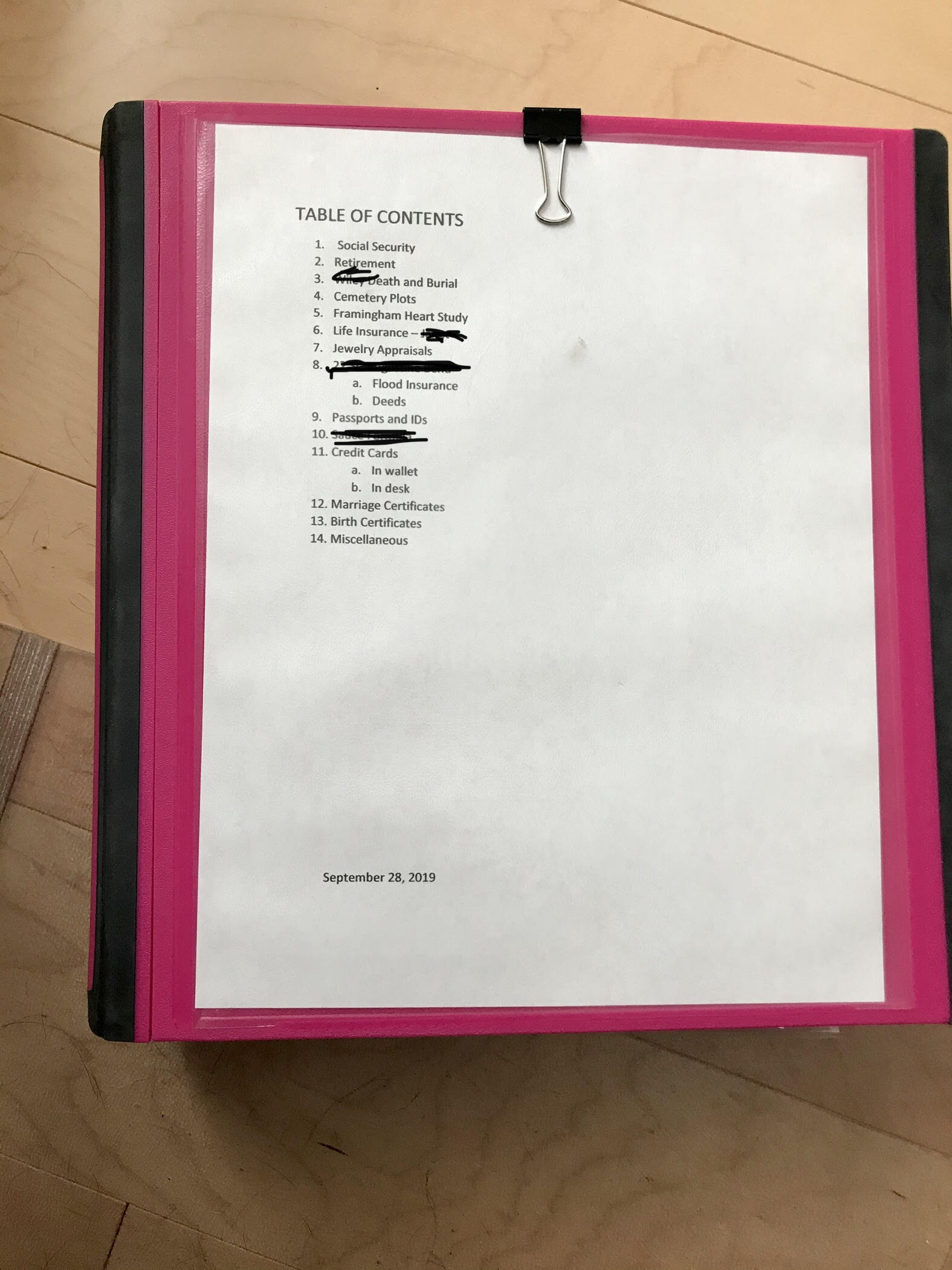 I’ll get it out of the way right now. I am an organized person. A bit on the obsessive/compulsive side. Always have been. About five years ago, I started wondering what would W do if something happened to me and I was unable to let him know where all the important stuff is located. Then I projected out to our son B…what a mess I would have left for him to sort through. I had already seen snippets of this playing out with the loss of our parents. I didn’t share this concern with W as I didn’t want his feelings to be hurt….but he would have been wicked lost. So I created this bright pink 3 ring notebook that will be noticed in any bookshelf. It contains all important items…or notes on where those items would be found. For instance, our life insurance policies were too big to place in the notebook, so I put the most recent receipt for them in the plastic insert and then left a note on the receipt explaining where the insurance policies were kept. Creating this record allowed my anxiety to get below the raging point. (We will discuss my anxiety later.)